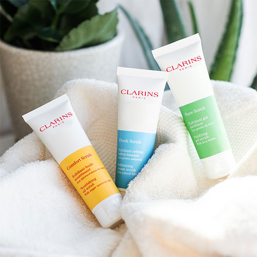 La gamme de produits exfoliants Clarins offre une palette de soins gommants pour tous les types de peaux. Crème peeling sans micro-grains, produit gommant à grains très doux et rafraîchissants, Exfoliant Gel purifiant pour peaux mixtes à grasses, Exfoliant Huile nourrissant pour les peaux sèches.